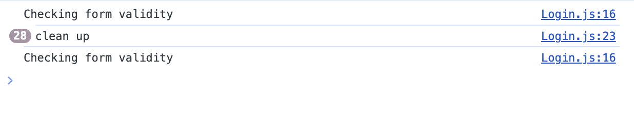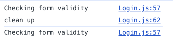 처음 렌더링 될 때 useEffect안에 있는 유효성 검사 함수가 실행이 되는걸 알 수 있다. 여기서 클린업 함수가 실행이 되지 않는 이유는 첫번째 사이드 이펙트가 실행되기 전에는 실행이 되지 않기 때문이다. 여기서 한문자라도 입력하면 클린업함수가 실행이 된다.