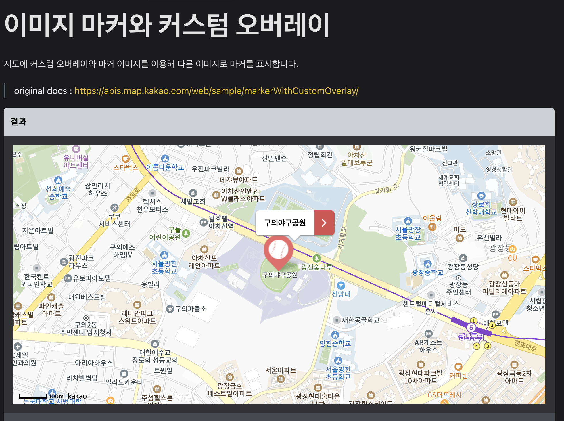예제를 보고 필요한 기능에 맞는 코드를 그냥 복사해서 붙여넣기만 하면 된다. 우리가 필요한 기능은 지도에 1, 2, 3번 순서대로 핑을 찍어줘야 하는데 커스텀이 가능하면서도 상세페지로 이동도 가능한 방법을 찾다가 다행히 좋은 방법을 찾았다.