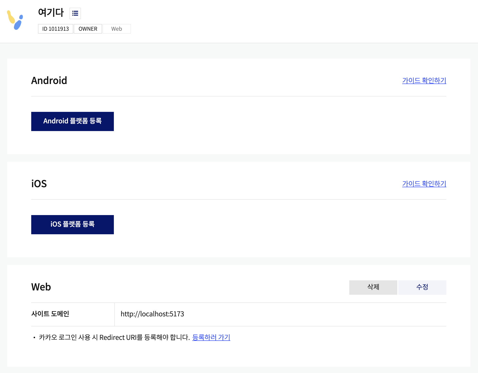 그리고 플랫폼까지 등록해야한다. 우리가 쓰는 프로젝트 도메인은 http://localhost:5173이다. 뒤에 /를 붙이면 안되니까 꼭 빼고 등록해야 한다.