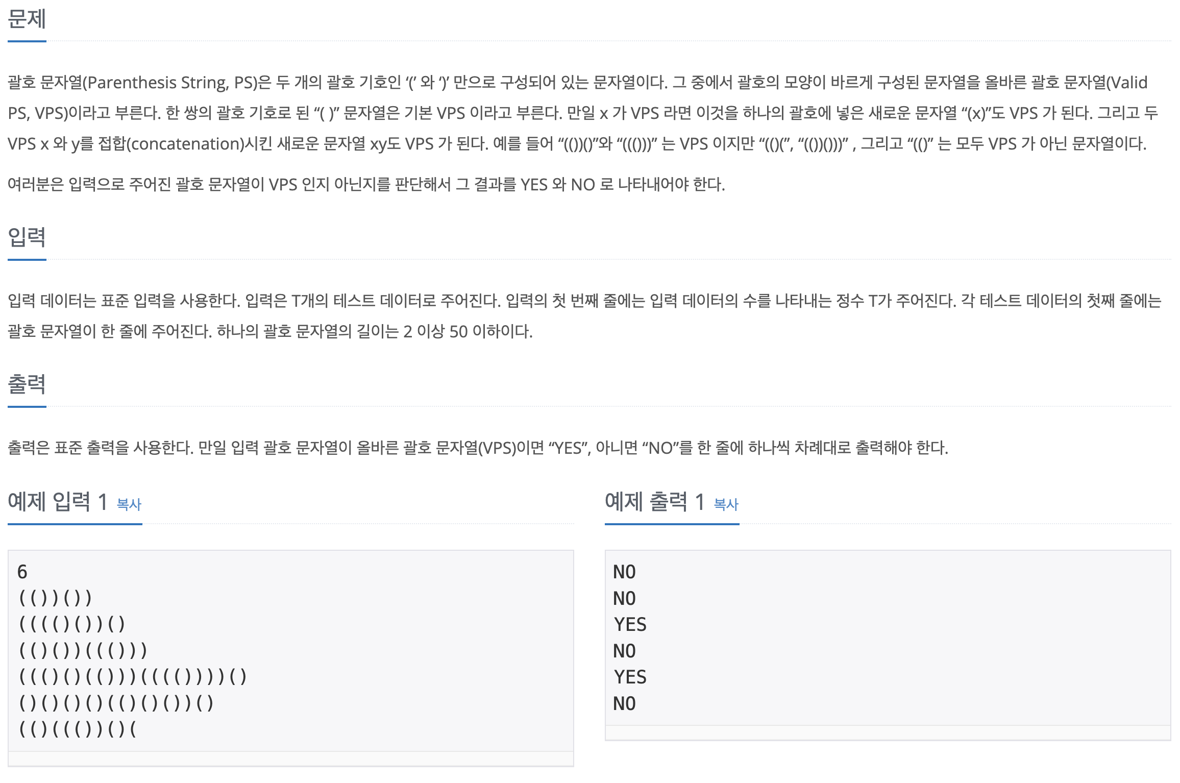 괄호 문자열(Parenthesis String, PS)은 두 개의 괄호 기호인 ‘(’ 와 ‘)’ 만으로 구성되어 있는 문자열이다. 그 중에서 괄호의 모양이 바르게 구성된 문자열을 올바른 괄호 문자열(Valid PS, VPS)이라고