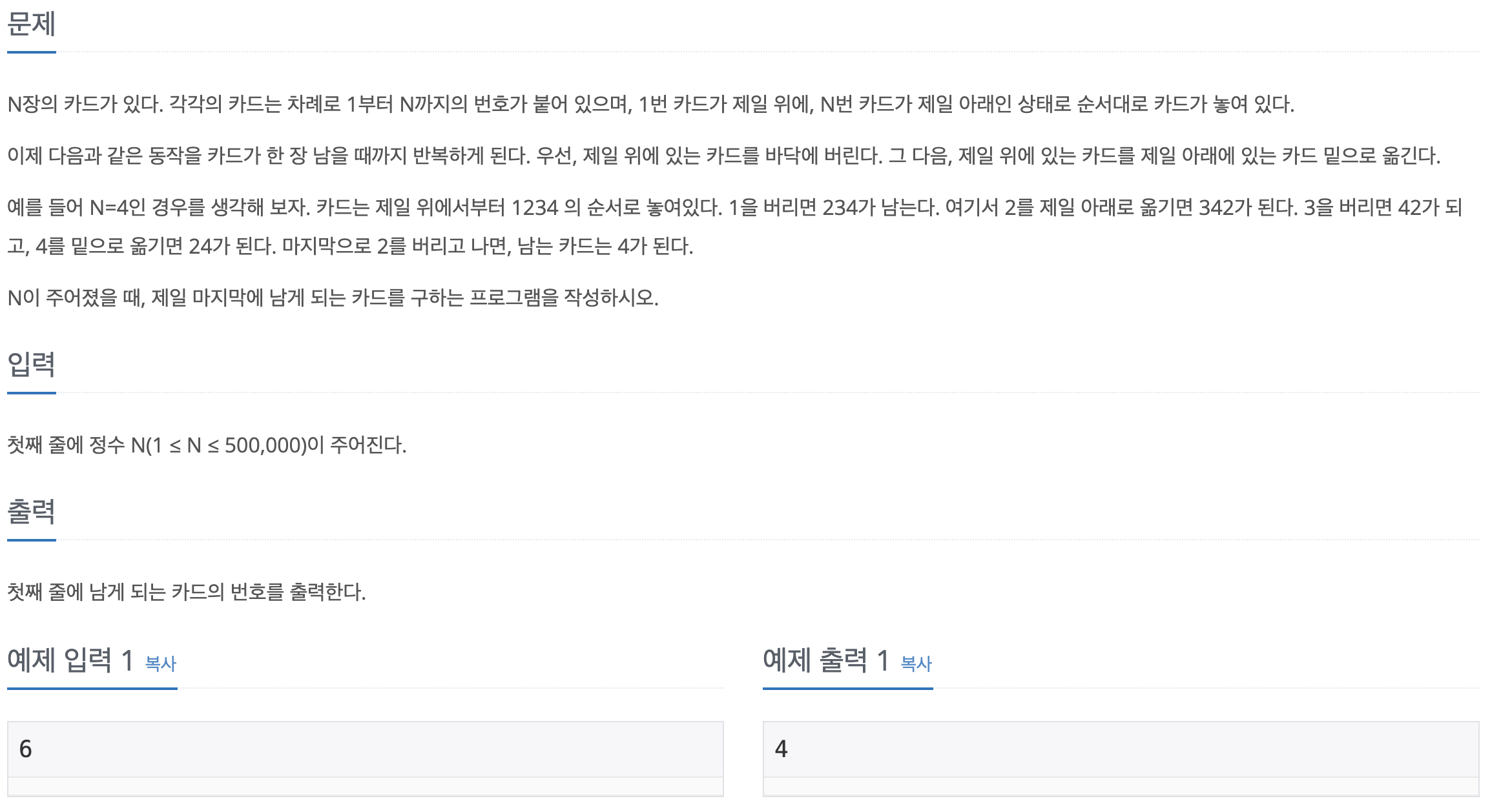 N장의 카드가 있다. 각각의 카드는 차례로 1부터 N까지의 번호가 붙어 있으며, 1번 카드가 제일 위에, N번 카드가 제일 아래인 상태로 순서대로 카드가 놓여 있다. 이제 다음과 같은 동작을 카드가