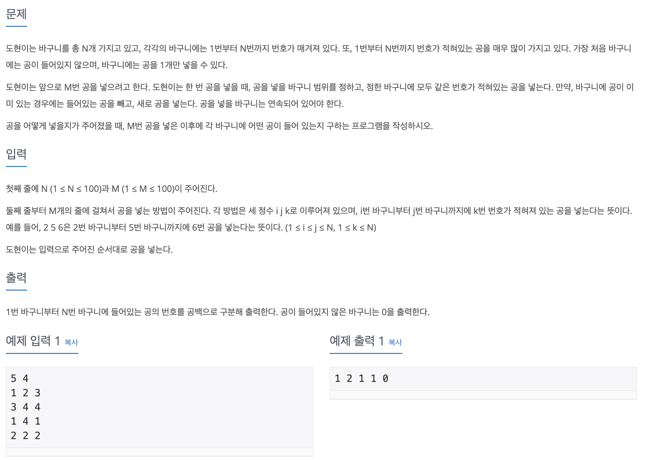 2번째줄부터는 바구니의 범위와 공의 번호가 주어진다.